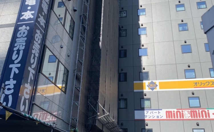 アンカーの打てない10階建て高層ビル仮設足場施工事例